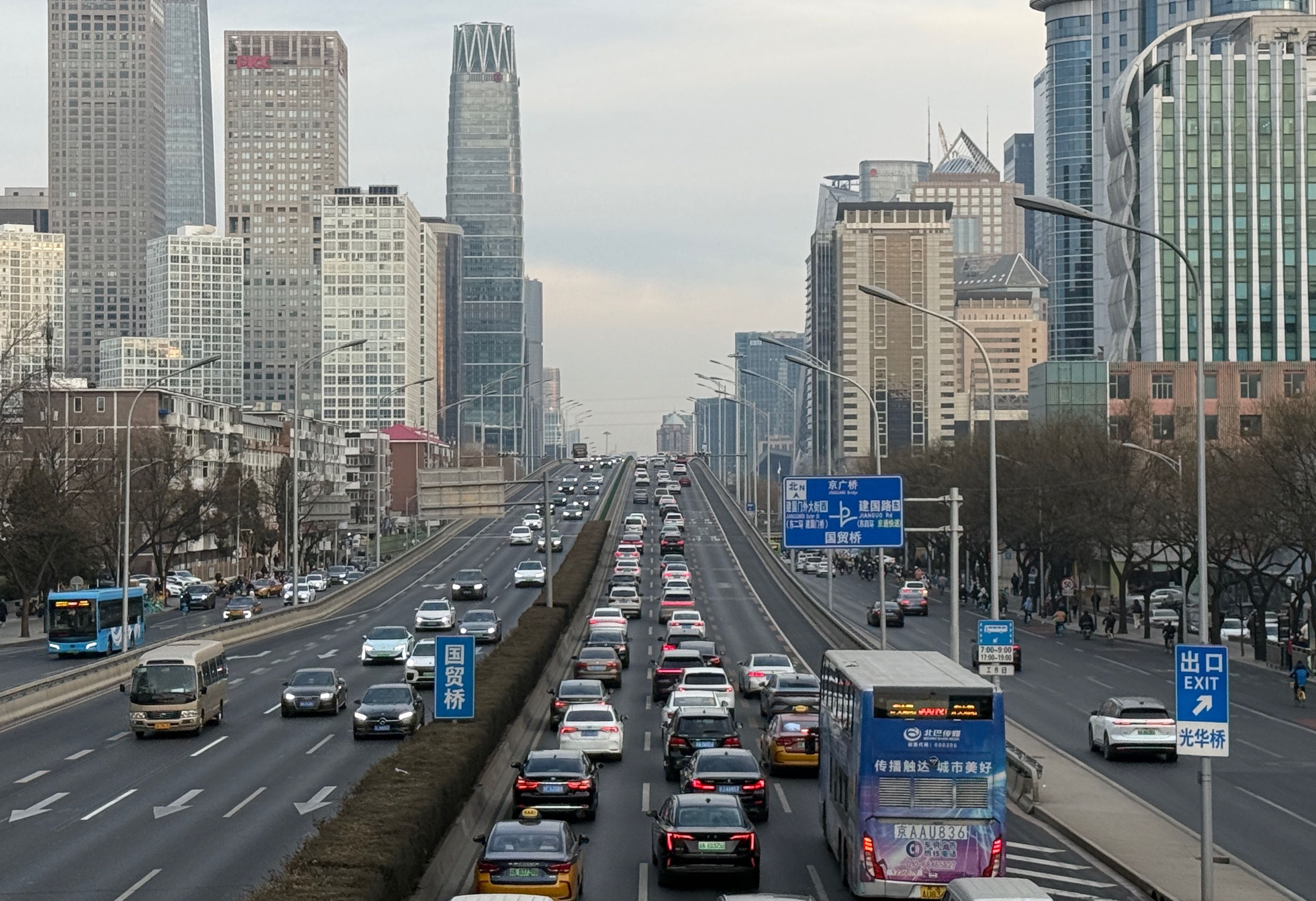 国贸桥,东三环主路南向北方向车流行驶缓慢。新京报记者 王贵彬 摄