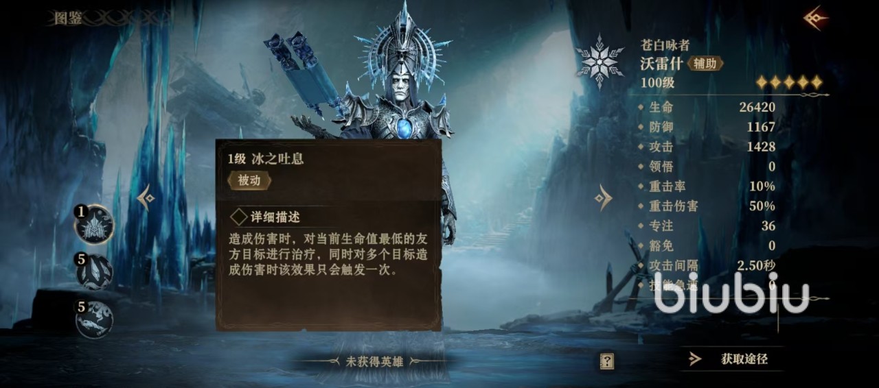战技寒冰之击,对敌方目标造成连续三次冰冻伤害,通过该技能造成伤害时,还有5%概率将目标身上的一个增益状态移除,这三次伤害基本上可以保证100%移除一个增益,能大大削弱对方,至于消除的是哪一个增益状态则无法判定。威能技寒冰诅咒,对所有的敌方目标造成三次冷冻伤害,并有75%几率施加增益无效状态,持续10秒钟,对方被增益无效状态影响之后,就无法获得增益状态,这对于一些依靠增益来起决定性作用的流派来说,是很重要的削弱,大大延缓了对方的整体强度和节奏。