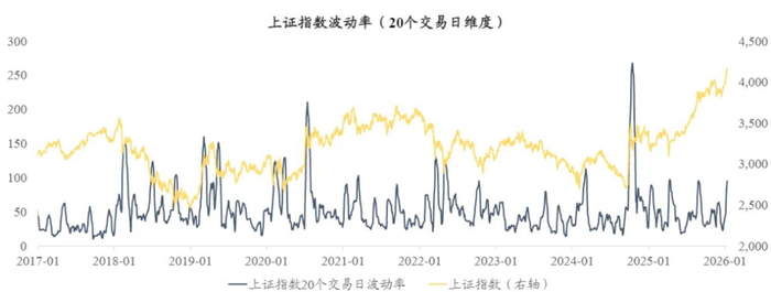 该机构认为,截至1月12日收盘,(由其构建的)波动率指标为95.2%,处于短线相对高位。在当前量能水平下,继续放量以维持波动率的难度较大,短线大概率以震荡整理、涨速放缓来修复波动率。