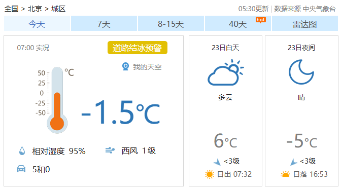 今天早晨至白天多云转晴,偏北风一级转三级左右,早安中下周起阵风六级左右,北京最高气温6℃;夜间晴,道路偏北风二级左右,结冰将轮京报最低气温-5℃。黄色换新