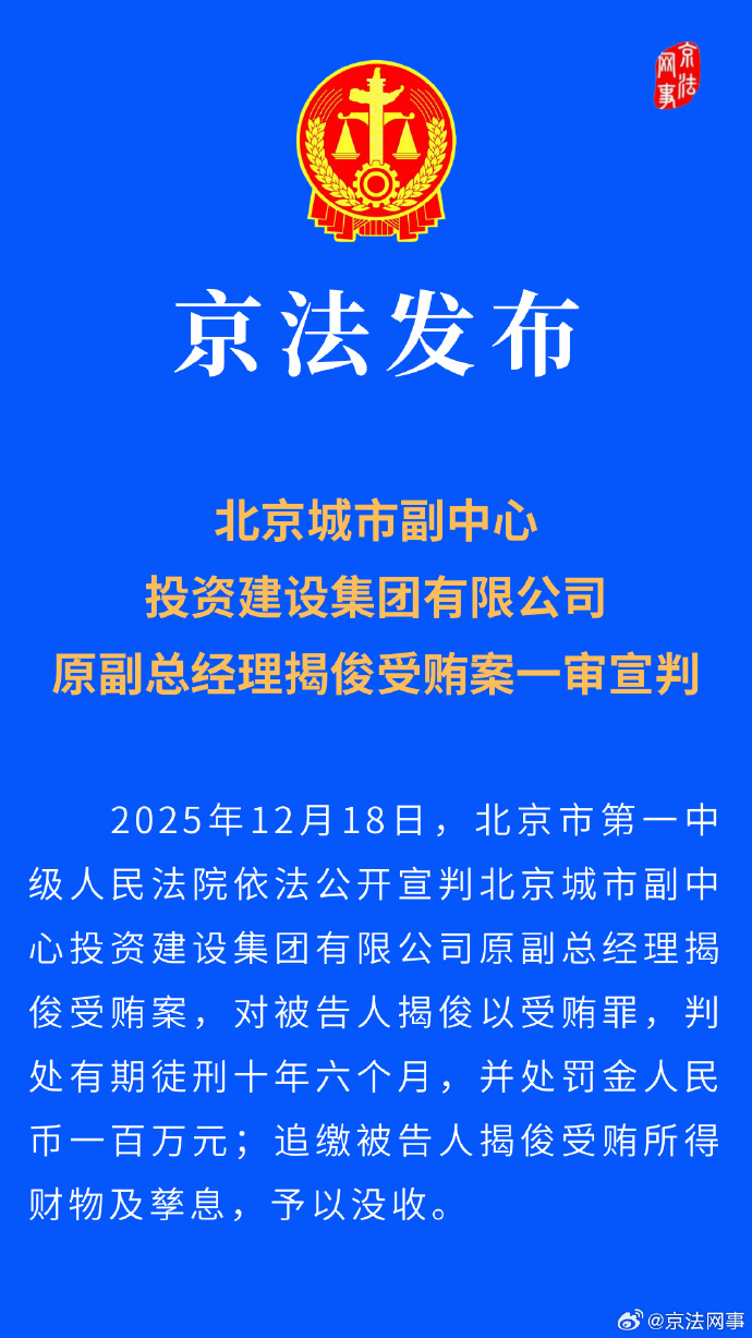 新京报讯 2025年12月18日,北京报北京市第一中级人民法院依法公开宣判北京城市副中心投资建设集团有限公司原副总经理揭俊受贿案,城市对被告人揭俊以受贿罪,副中副总判处有期徒刑十年六个月,心投刑年新京并处罚金人民币一百万元;追缴被告人揭俊受贿所得财物及孳息,资建予以没收。设集审获