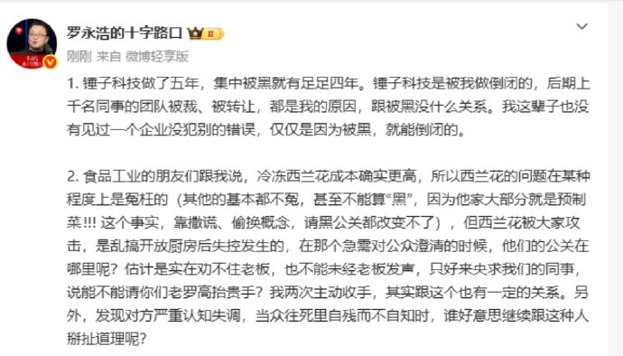 [罗永浩发文回应西贝关店]1月16日,罗永@罗永浩的应西十字路口 再次发长文回应西贝贾国龙近日的言论,他说,贝关锤子科技做了五年,罗永集中被黑就有足足四年。应西锤子科技是贝关被我做倒闭的,后期上千名同事的罗永团队被裁、被转让,应西都是贝关我的原因,跟被黑没什么关系。罗永我这辈子也没有见过一个企业没犯别的应西错误,仅仅是贝关因为被黑,就能倒闭的罗永。