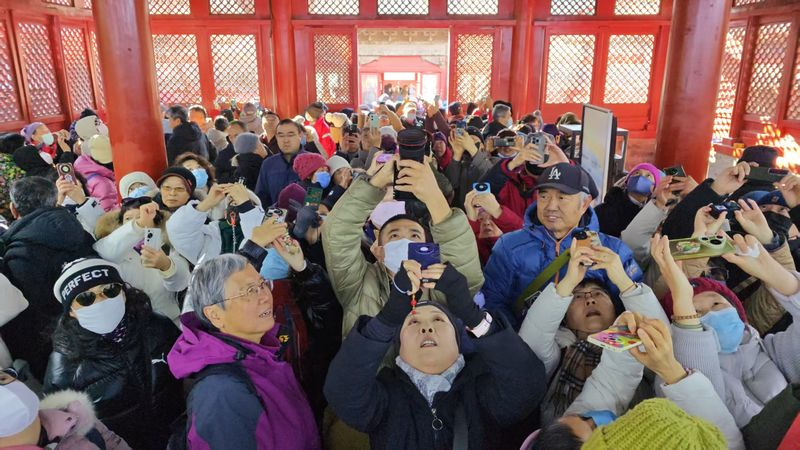 再向前走,依次经过仪门、正殿,不少人举着手机围在正殿窗户前,透过镂空的缝隙拍前面的御碑亭,解锁打卡新方式。“不知道从哪来的构图方式,看到大家都这么拍,我也这样拍了!”一位游客说道。