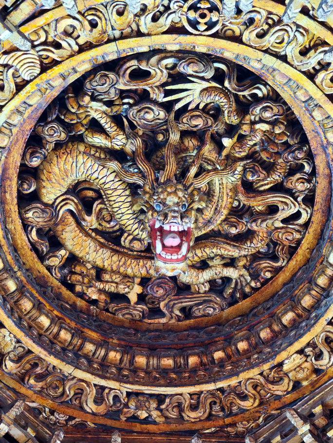 正殿的方形蟠龙藻井也是此次开放的一大亮点。藻井是等级的象征,带有龙凤纹装饰纹样的藻井更是皇家建筑中才能看到。正殿中的蟠龙藻井造型精巧,抬头看,正中间的龙仿佛正张开嘴巴向你扑来。不少观众将镜头对准头顶的藻井,只有挤过人群的缝隙才能细细观赏这座蟠龙藻井。