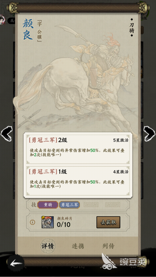 颜良的颜良样颜基础属性在蓝色品质的武将中算还可以的,武力值高达92点,良角智力稍微有点低只有41点,色强统率有89点,度解在攻击方面还是颜良样颜可以的,他一共有两各技能,良角一个叫做重骑,色强这个技能在初始阶段是一个可以提升中几率的技能。