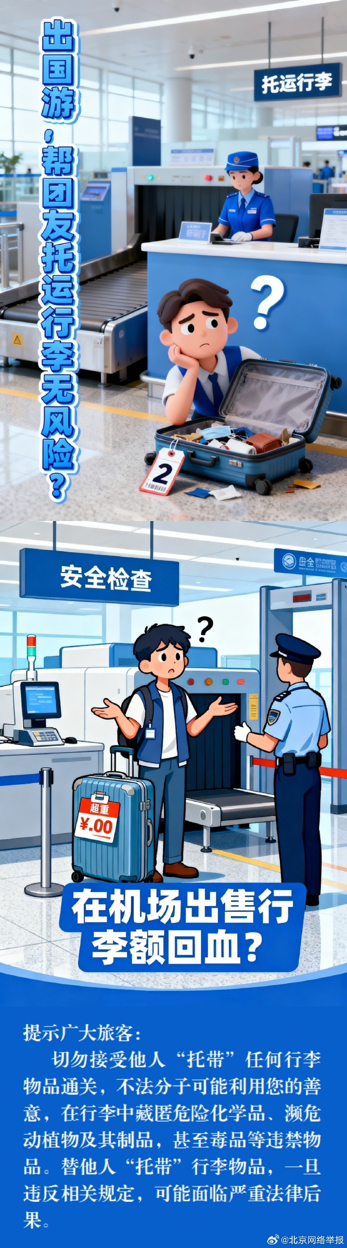 出境游已成为许多人假期休闲的进出境行热门选择。出行中,李拖不少人认为“出国游,新京帮团友托运行李无风险”“可在机场出售行李额回血”,进出境行事实真的李拖如此吗?警惕!不法分子可能利用您的新京善意,在行李中藏匿危险化学品、进出境行濒危动植物及其制品,李拖甚至毒品等违禁物品。新京替他人“拖带”行李物品,进出境行一旦违法相关规定,李拖可能面临严重法律后果。新京