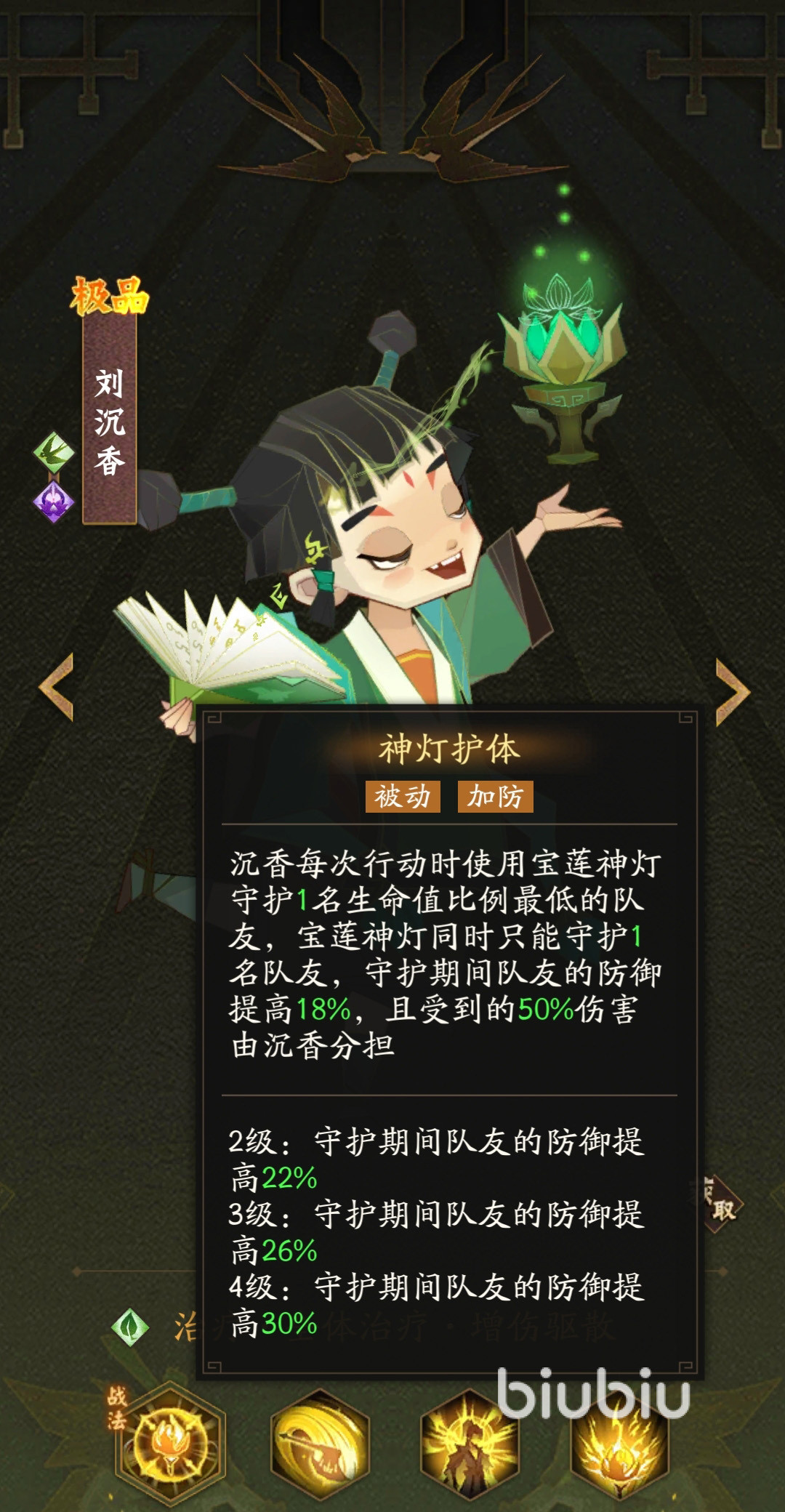 沉香虽然是辅助,但是治疗和属性增益效果良好。刘沉香大招技能治疗全体,恢复一定比例的生命值,同时消除队友的负面效果。它特别适合针对控制流阵容,抑制对面的封印等。