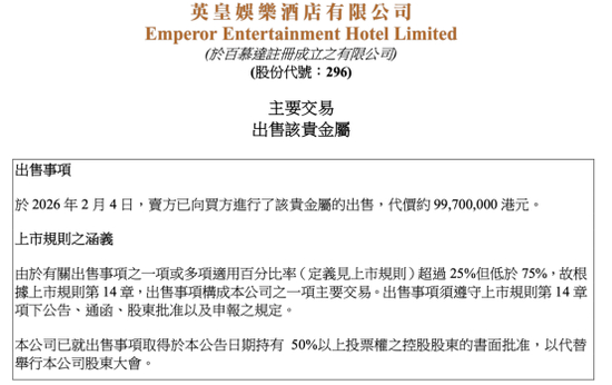 “鉴于当前的市场状况以及该贵金属的市场价格目前处于高位水平,董事认为出售事项对公司而言是一个实现和释放该贵金属价值的良好机会,同时使公司未来能够节省与该贵金属相关的保安及保险费用。”英皇娱乐酒店表示。