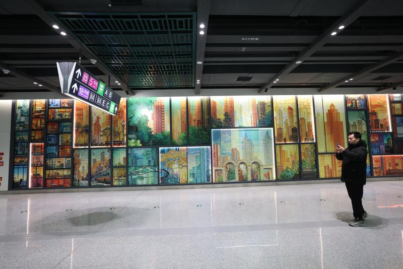 市民在天通苑站壁画前打卡拍照。新京报记者 王贵彬 摄