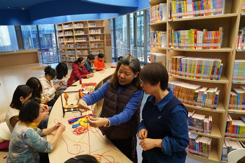 海淀图书馆永丰馆,在迎新年非遗手工结绳活动上,市民跟着非遗传承人体验绳结编织技艺。新京报记者 浦峰 摄