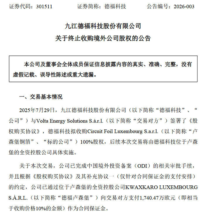 此前于2025年7月,德福科技与Volta Energy Solutions S.à.r.l.签署协议,拟收购后者旗下卢森堡铜箔100%股权,后续交易由德福科技位于卢森堡的全资控股公司德福卢森堡(KWAXKARO LUXEMBOURG S.À.R.L.)具体实施。该交易已完成中国境外投资备案(ODI)的相关审批手续,并通过德福卢森堡向交易对方支付1740.47万欧元(约合人民币1.42亿元,即相当于收购价格10%的金额)作为合同保证金。