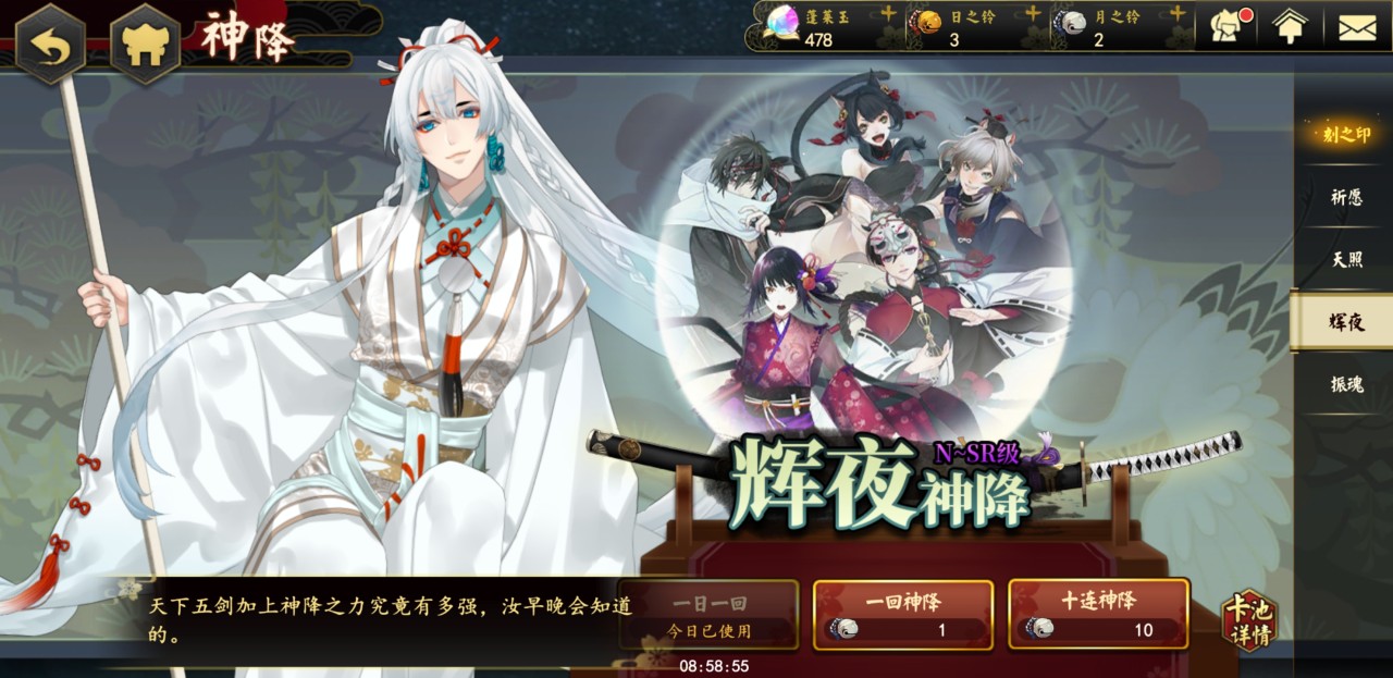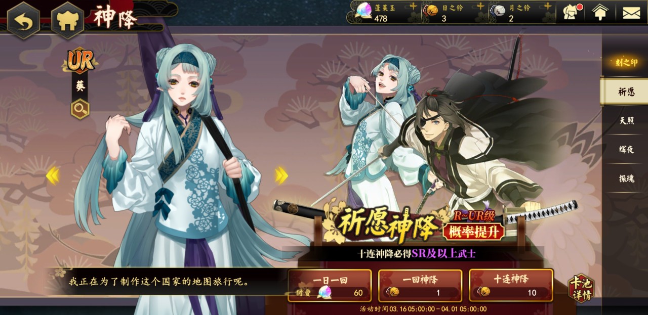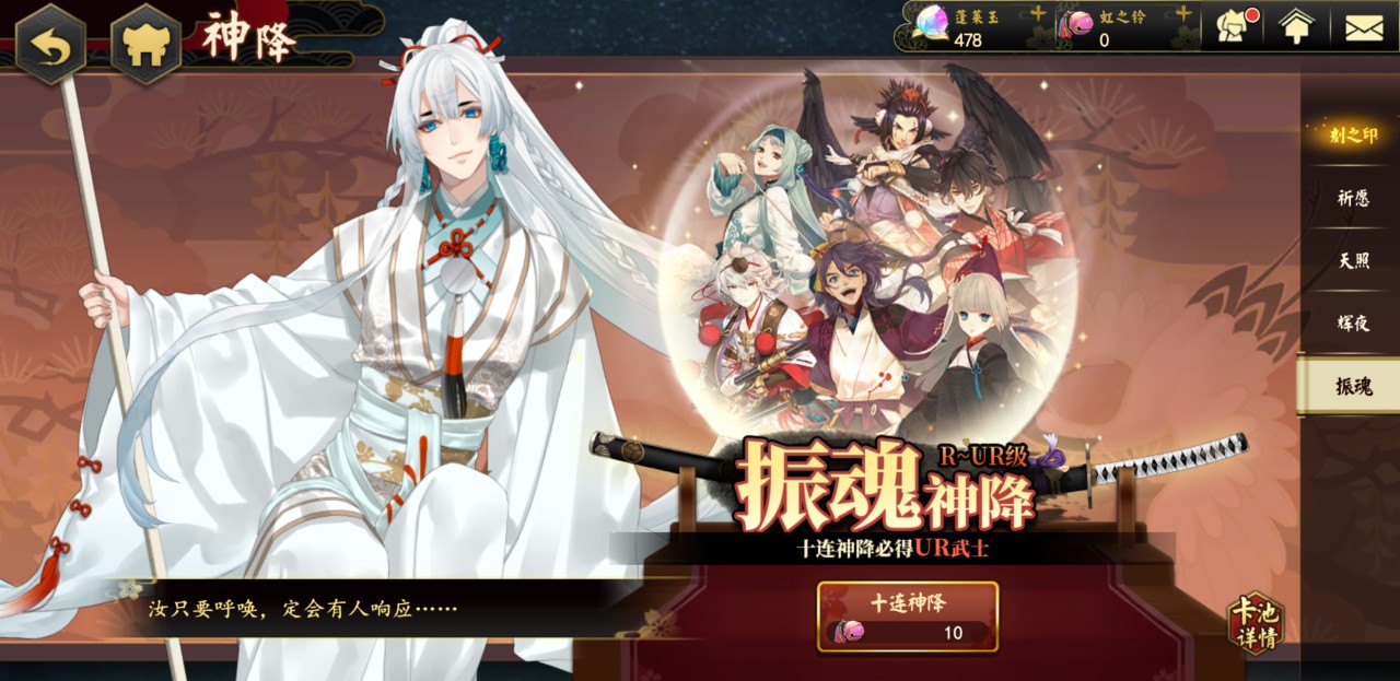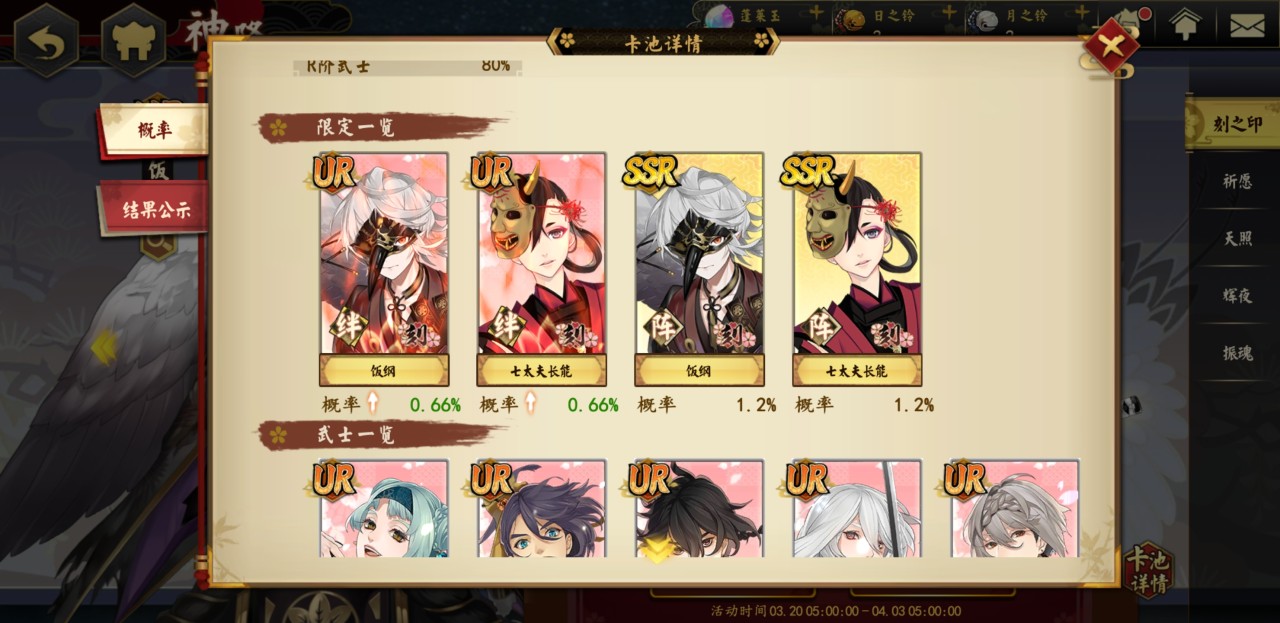 和这种方式相同的是天照抽取途径,这种方式同样需要金铃铛,并且和祈愿途径的抽取机制一模一样,玩家同样可以通过这种方式来抽取所以的武士,但是概率没有祈愿模式的大。
