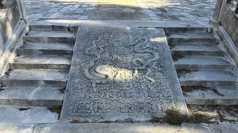 走进陵寝,祾恩殿仍遗存台基与御路石雕,柱础石清晰勾勒出当年殿宇的恢宏规模。尤其是御路上的二龙戏珠图案,比献陵的一色云纹更为精致壮观。