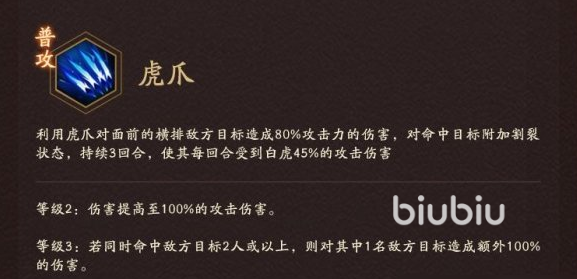 白虎的普攻也带有割裂的效果,同时攻击范围也比较大,是对一整个横排的地方目标进行攻击,如果同时命中了两个以上的敌人,还能够对其中一个敌人造成100%的额外伤害,能够非常好的压制敌人血量。