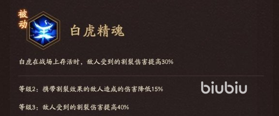 白虎的被动技能非常契合其割裂的debuff,只要白虎这个角色还存活,割裂效果就会提高三成,升到满级以后的技能将额外提升到50%,持续伤害非常高。