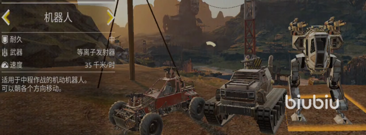 第二个缺点则是初始装填速度太慢,攻击冷却较长,在这个冷却的期间一旦被攻击,很容易让自身陷入劣势。第二个要介绍的是机器人,它的速度行走是三种战车之中最慢的,但是它的操作很灵活,反而有不少玩家很喜欢它的行动方式。它的装甲属于普通型,不算高,也不算低。初始的输出武器则是等离子发射器,这个武器的射程很远,输出伤害非常高,缺点是无法群攻,同时换弹的频率有些高。