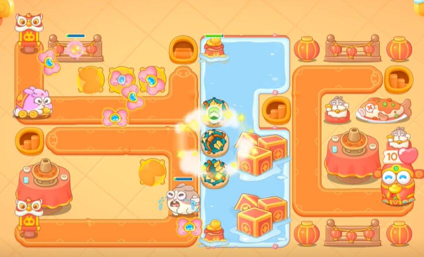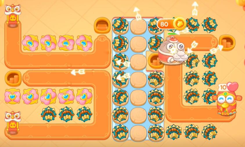 3、保卫在水池中建造两个多重箭塔,萝卜略攻击兔子和障碍物。福神