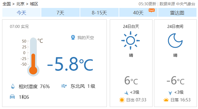 今天白天晴,偏北风一级转三四级,湾里阵风六七级,早安中周正式最高气温6℃;夜间晴,北京报偏北风三级左右,大风阵风六七级,蓝色最低气温-6℃。开业