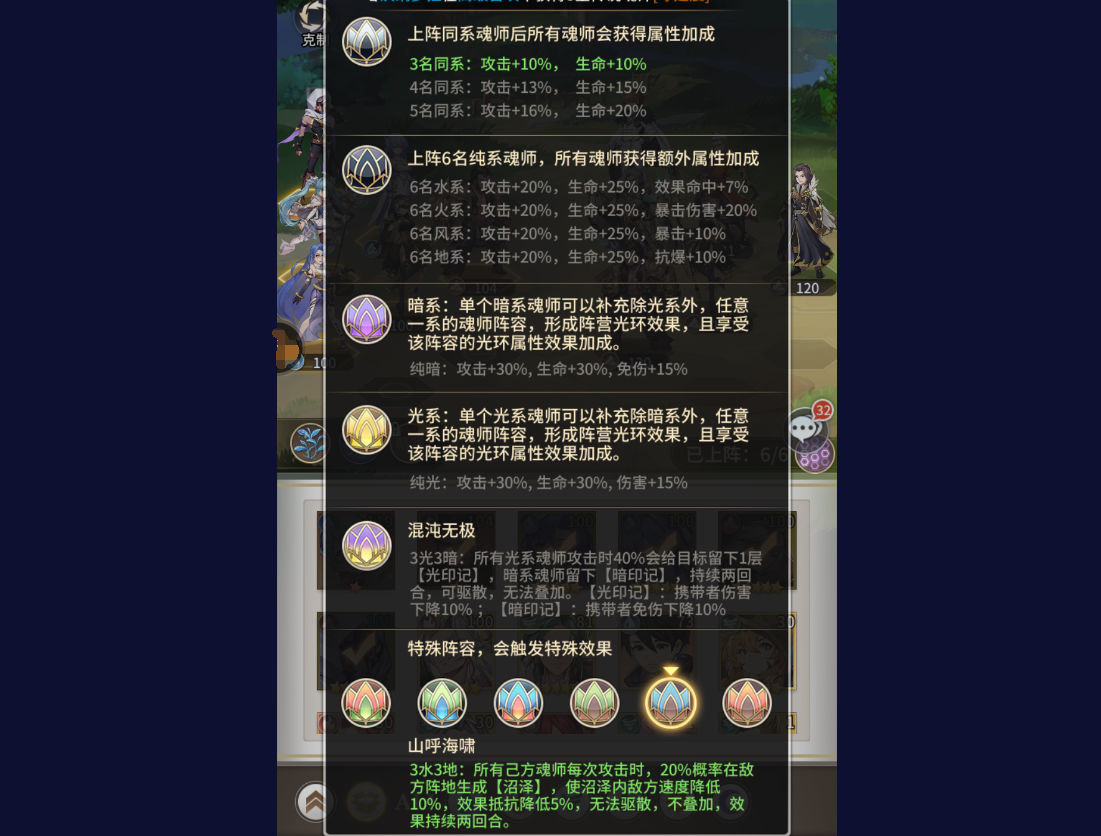 第二套阵容不是很完善,这套阵容是融合阵容以风系为主光系或者暗系为辅来组合的阵容,大家在组阵容的时候尽量将自己的风属性魂师上阵,然后空出一两个位置给其他系的魂师,这样这个阵容就可以激活光暗系的阵法了。这个阵法异常厉害,小伙伴们可以去试一下。