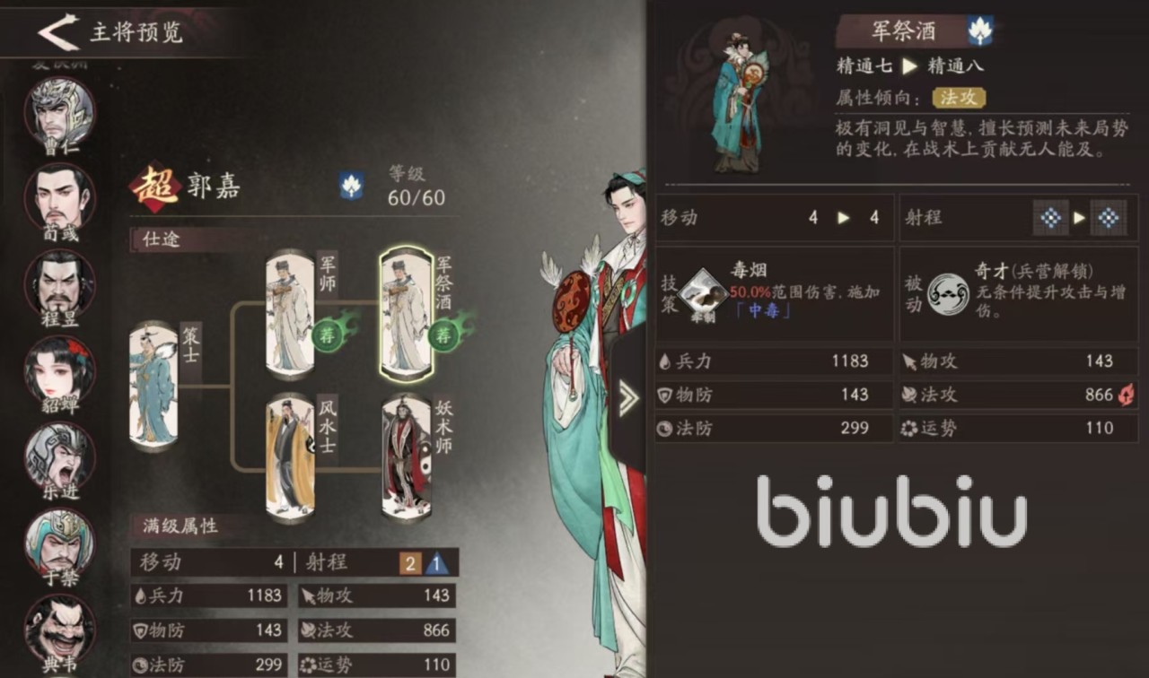 除了郭嘉之外,戏志才还比较适合搭配程昱,程昱天赋非常简单,攻击后为敌方附加随机减益buff,如果使用技能,那么在释放前还可以再附加一次减益Buff,并且对拥有buff的敌人有增伤和减伤效果。本身就比较强势的程昱,再配合上戏志才在输出和减伤方面的加成,使得自身的每一点优势都能够得到放大。其他同样适合的谋士主将还有简雍、荀攸等,虽然和这些谋士,并不是最佳配合,但也能发挥自身的作用。