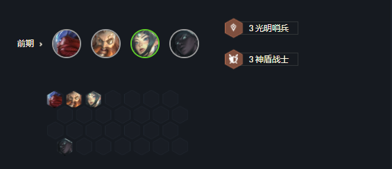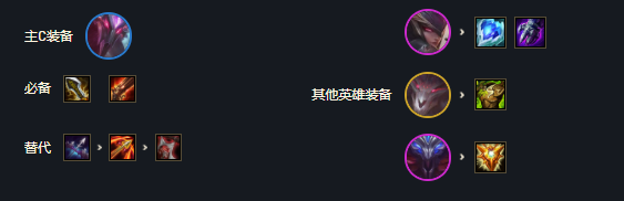 这套阵容主要是围绕魔腾来组成了4复生亡魂和4刺客羁绊,与之前2复生亡魂6刺客阵容相比,只保留了4刺客羁绊,让阵容的容错能力变得更强了,而且随着光明装备的加入,魔腾的爆发输出能力有增无减。魔腾、稻草人、艾翁和狗熊组成的4复生亡魂羁绊,在阵亡后复活并回复45%的最大生命值,让伤害和承伤提升30%,相当于人手一件加强版的复活甲。派克、魔腾、皎月和佛耶戈组成了4刺客羁绊,可以提升40%的暴击率和50%的暴击伤害,让魔腾有着非常稳定的输出。