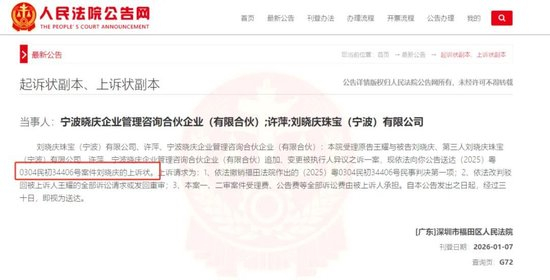 人民法院公告网显示,深圳市福田区人民法院1月7日刊登了刘晓庆的上诉状,上诉请求之一为依法改判驳回被上诉人王先生的全部诉讼请求或发回重审。
