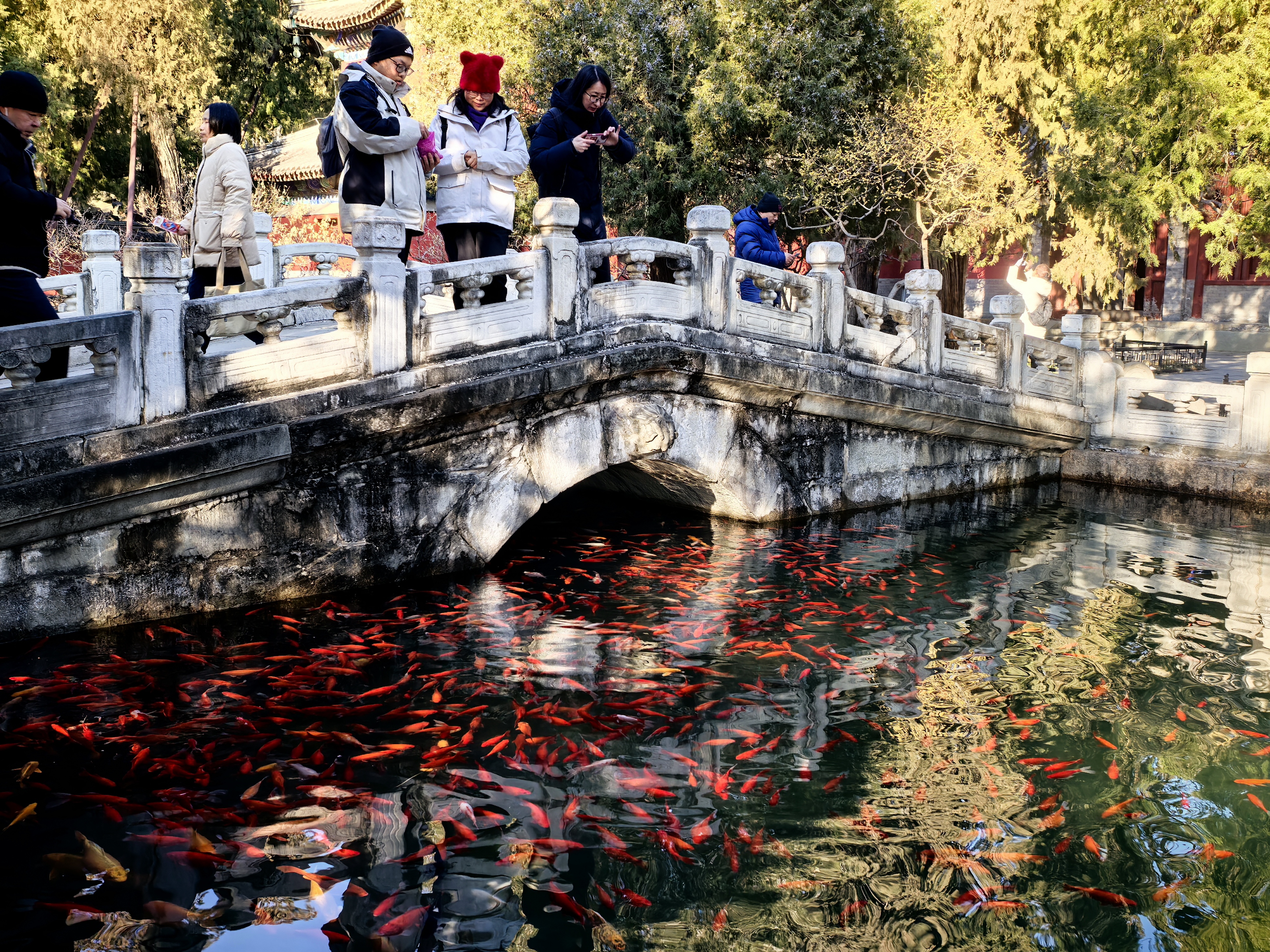 国家植物园北园卧佛寺内的数株早花蜡梅正值盛花期,金黄的花朵缀在枝头,虬曲的枝干搭配素雅的黄花,与古建红墙相映成趣,吸引游客们驻足观赏拍照留念。天王殿前的池塘里,数百尾红鱼游荡其间,游客们在这里拍照打卡,许下新一年的美好愿望。