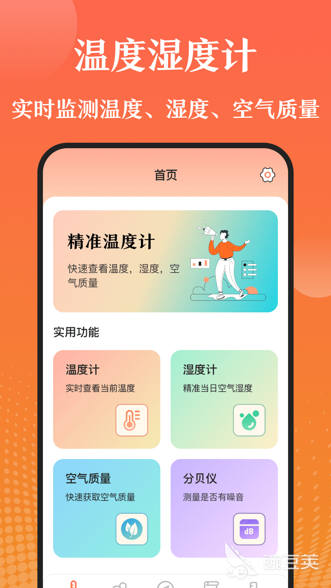 卡通风格的温的温温度计,让人一眼看了就喜欢。手机手机可以实时地预测出室内的软件温度,让你及时地选择好今天还穿多厚的分享衣服。此外,还可实时地显示各种天气预报,例如能当天的天气,还有空气中的湿度。然后也可以利用手机里的智能工具箱,随心测量不同的数据,满足生活所需。